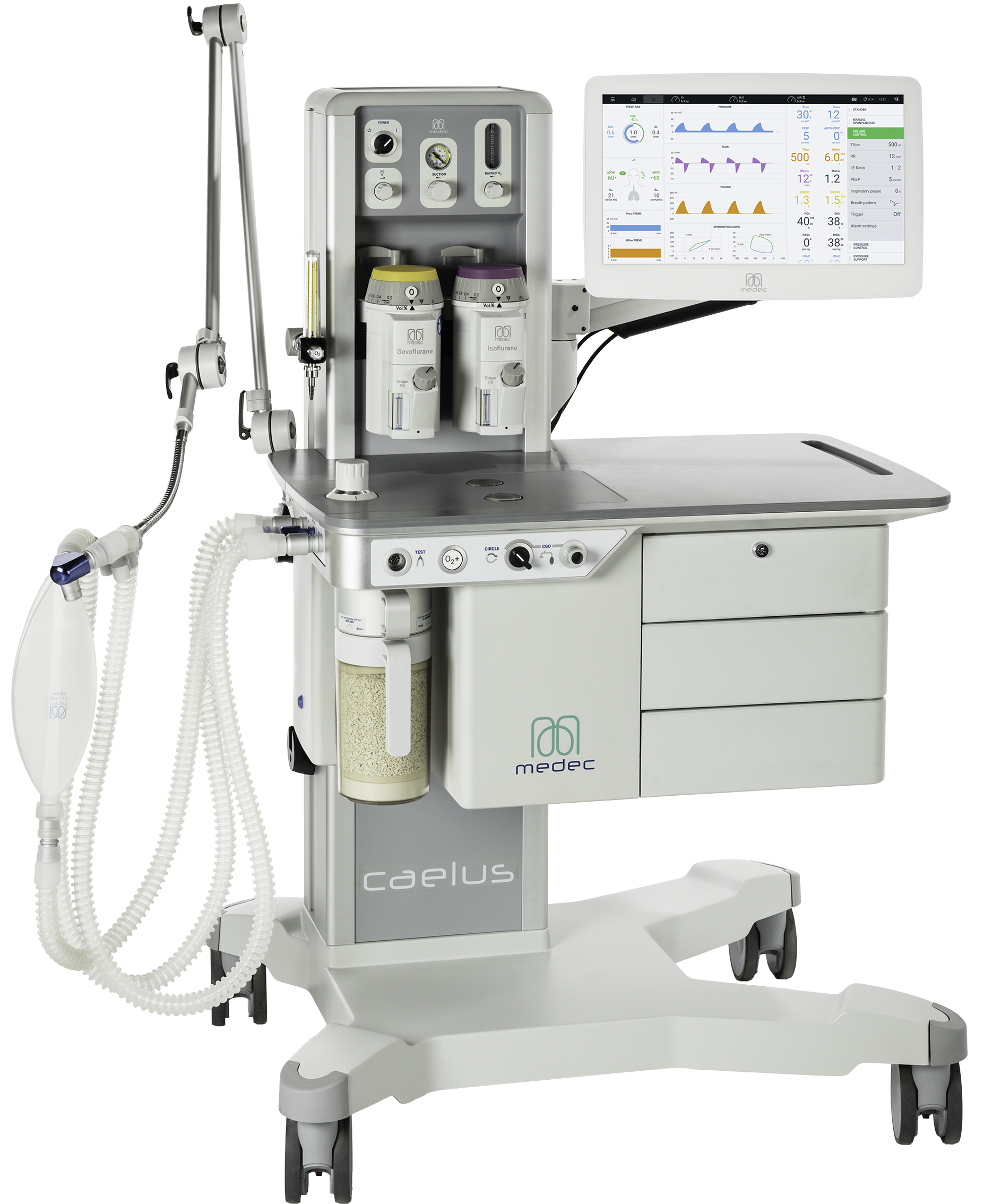 Ventilateur d'anesthésie contrôlé par microprocesseur incluant les packages logiciels : VCV-Man, Spont, HLM, PCV, SIMV-PC, SIMV-PSV/CPAP, PRVC, S-PRV, VCV, S-VV balanced flow ventilation, Lung Recruitment.