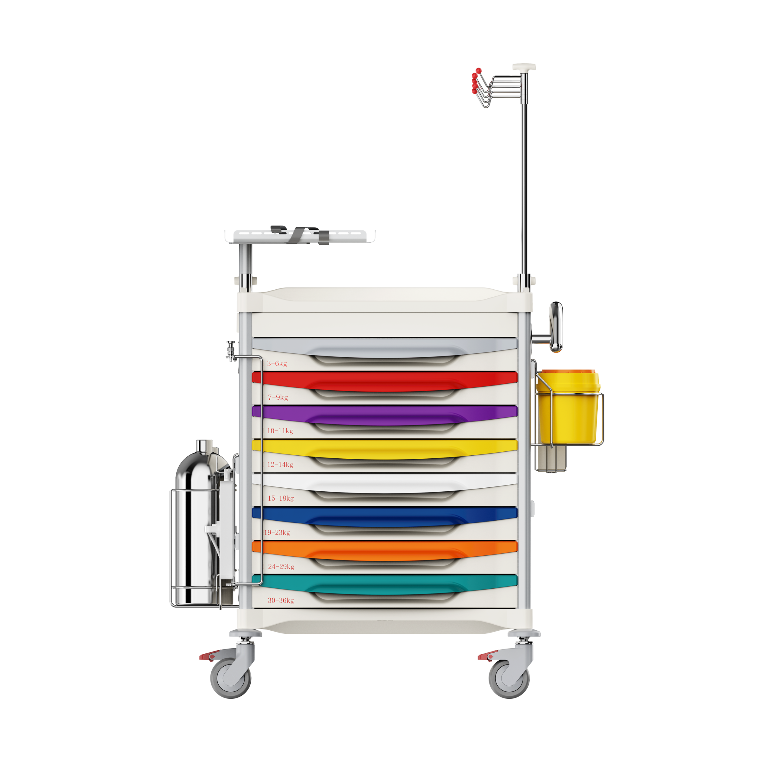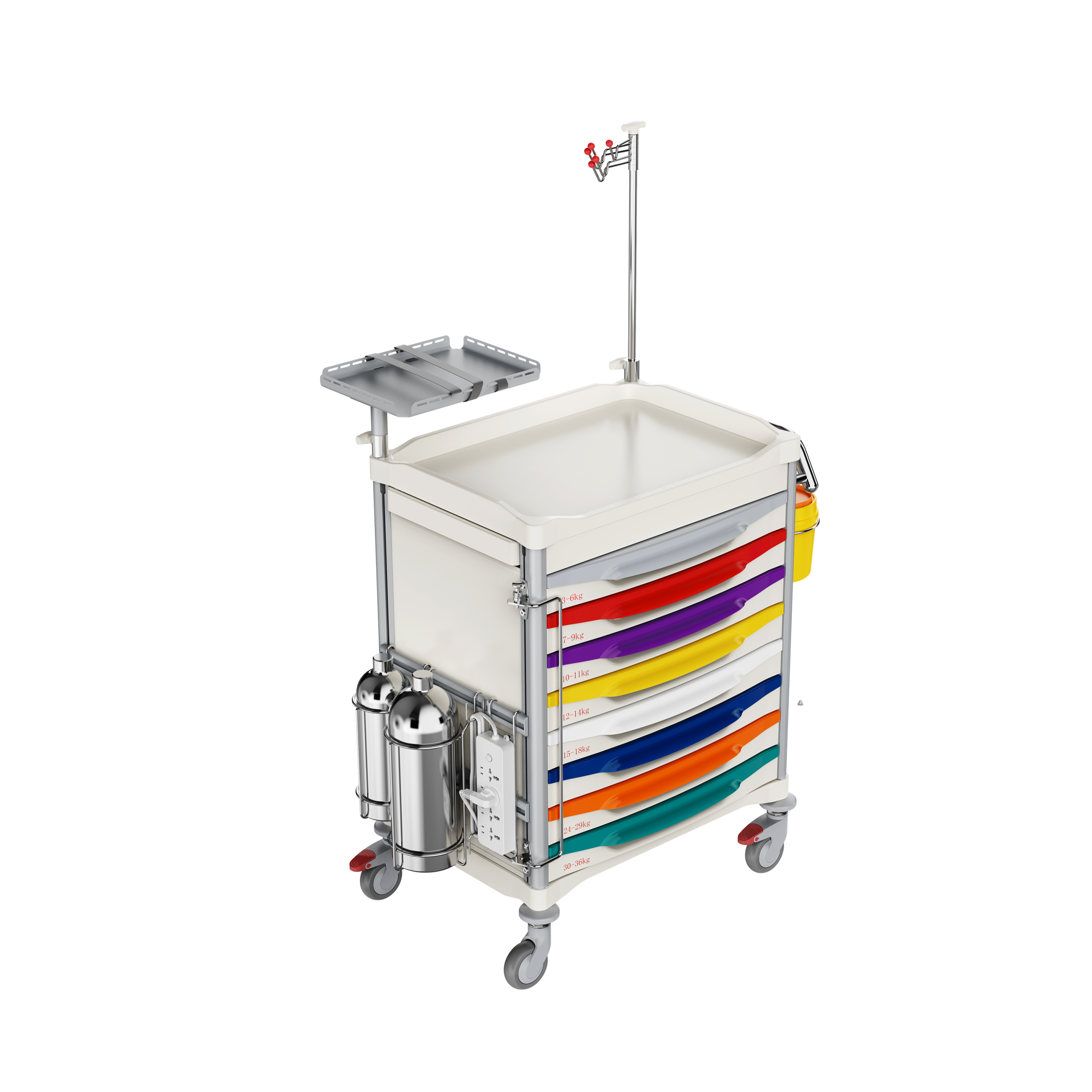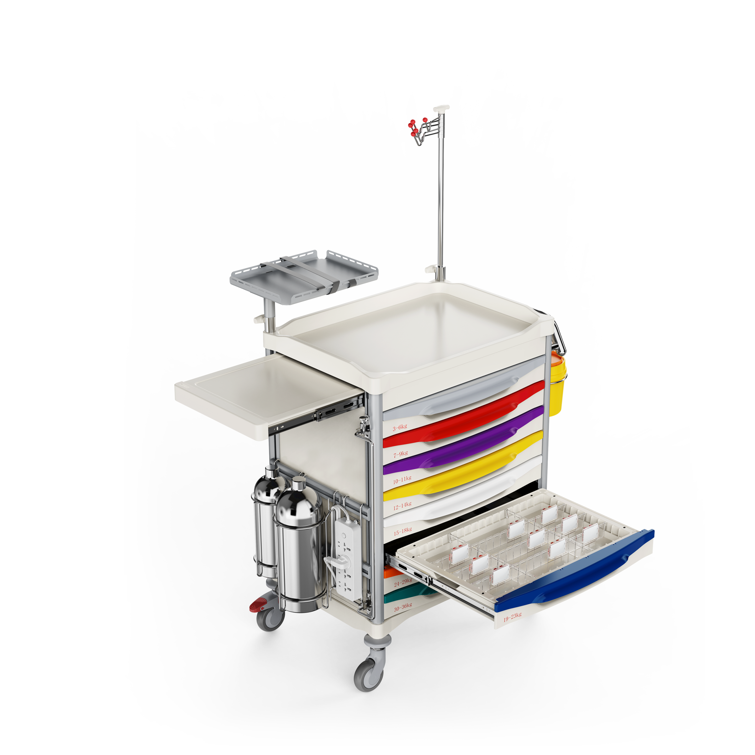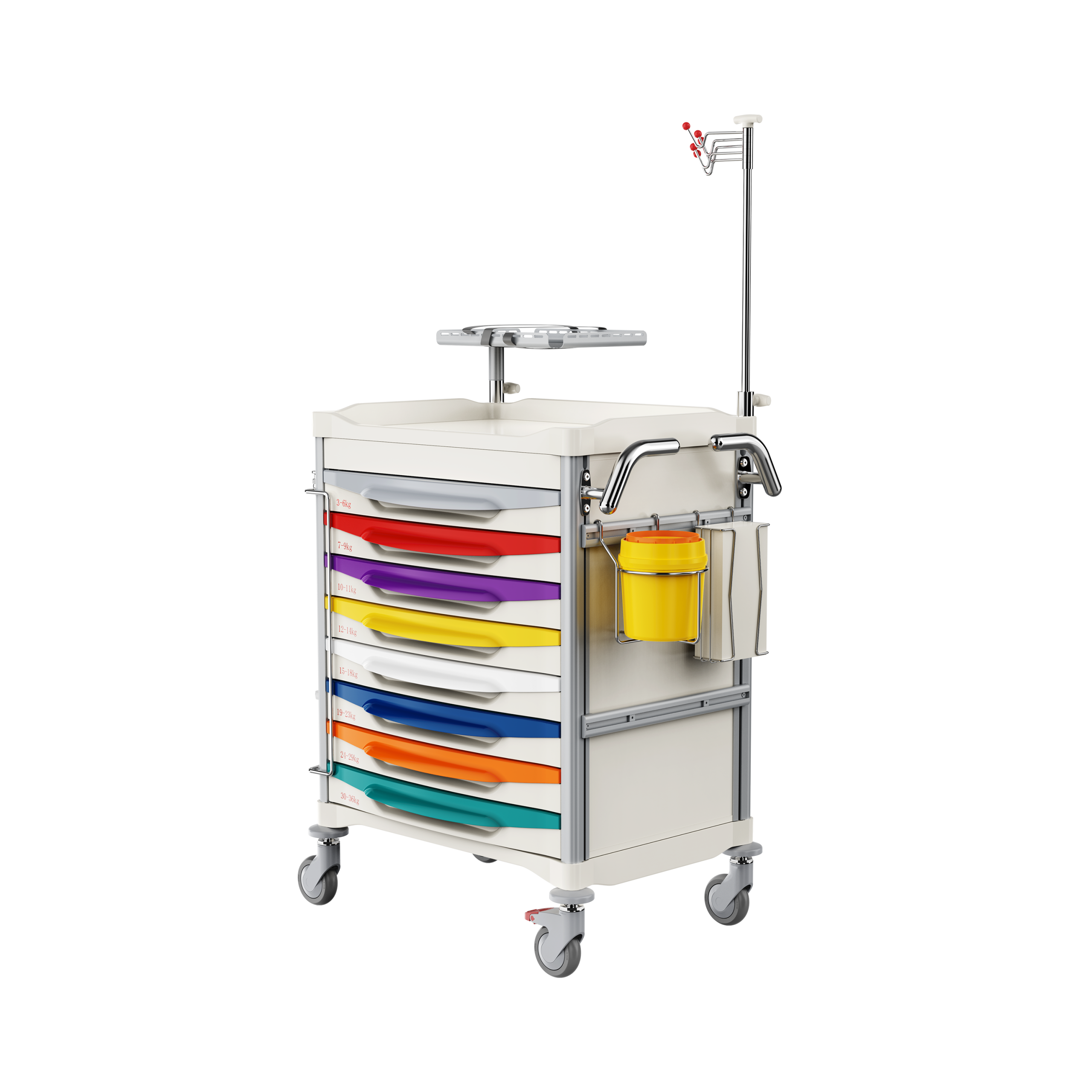 Chariot de stockage intelligent spécifiquement adapté aux situations d'urgence dans les environnements médicaux, permettant un positionnement précis et un accès rapide aux équipements essentiels.